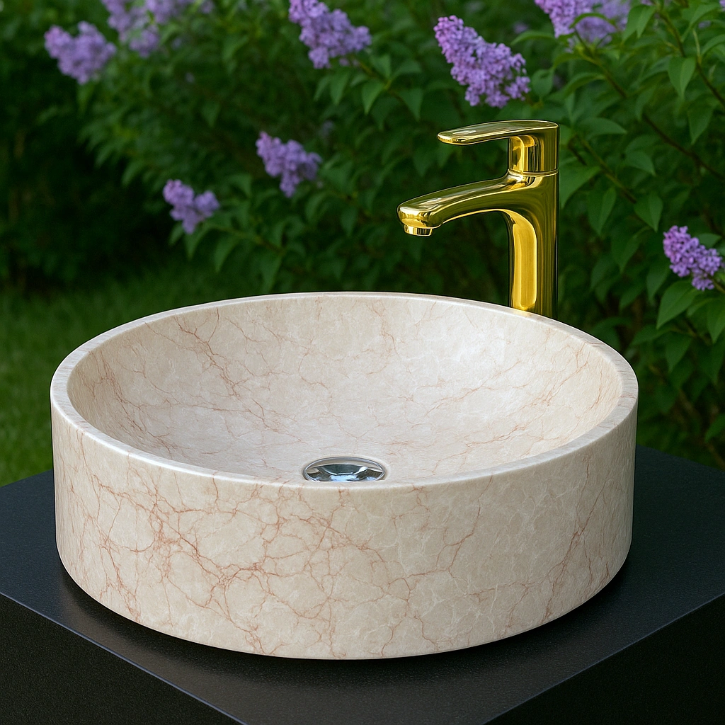 Yumuşak hatlara sahip yuvarlak formu, taşın doğal dokusunu estetik bir dengeyle sunarken, banyolarda lüks ve sıcak bir atmosfer oluşturur.